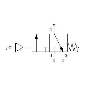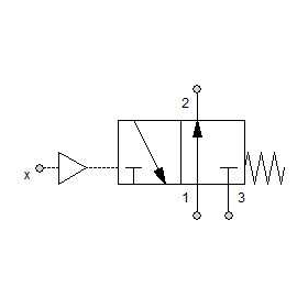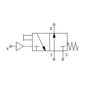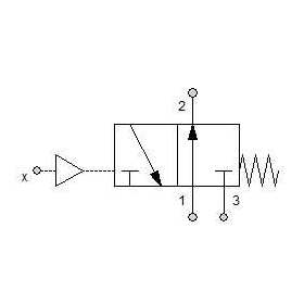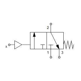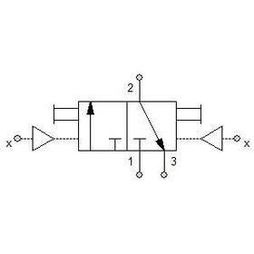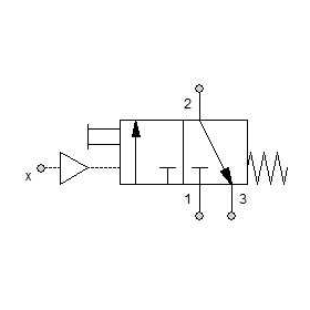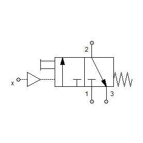 3/2 valve 1/8". Pneumatic pilot actuation. Flow at 6 bar: 400 Nl/min (ΔP 0.5 bar), 550 Nl/min (ΔP 1 bar).